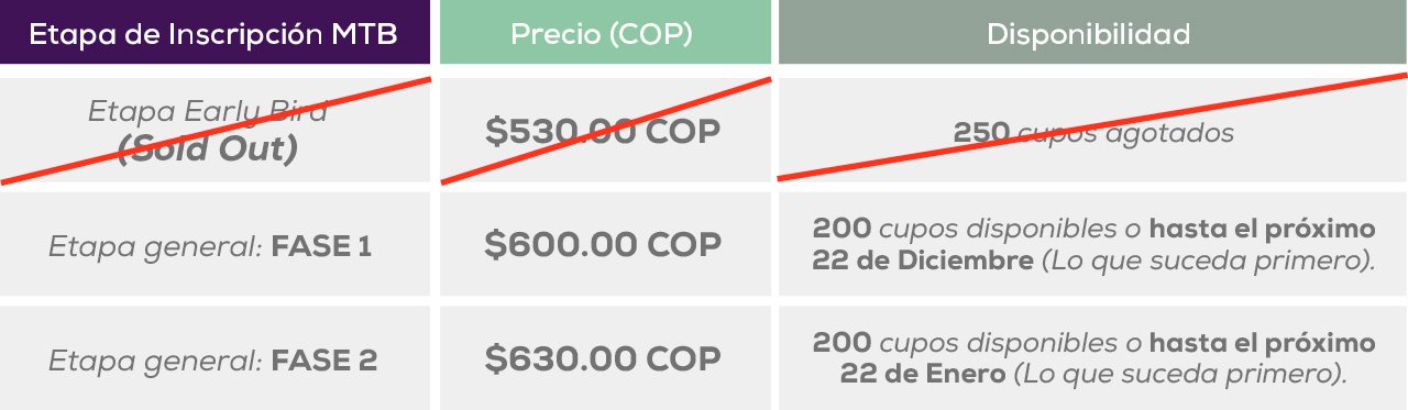No te quedes por fuera de este desafío MTB. Una vez que se completen los cupos o las fechas límite por etapa (lo que suceda primero), seguiremos con la siguiente fase de ventas con su respectivo incremento en el costo.